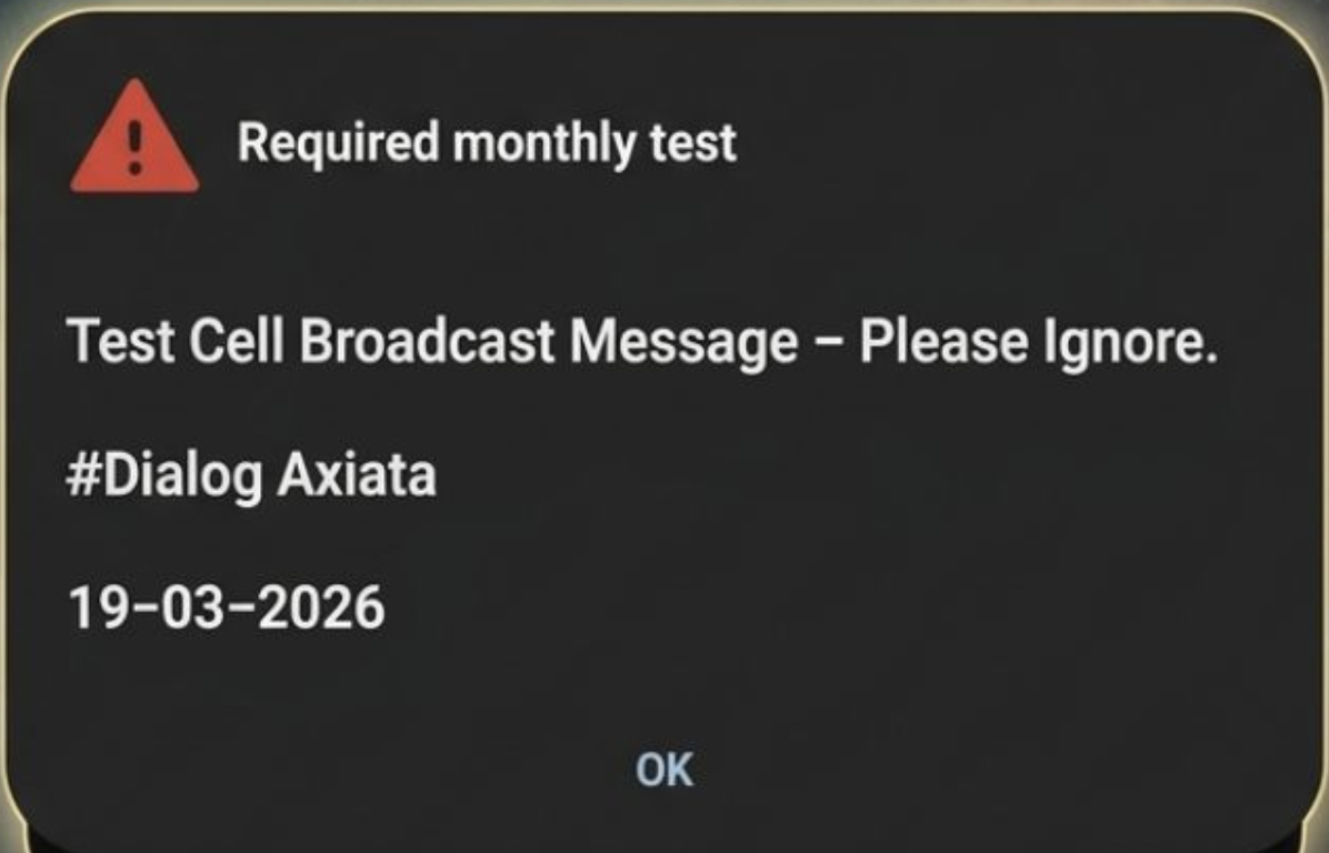 ඉහත රූපසටහනේ දැක්වෙන පරිදි, 2026 මාර්තු 19 වන දින Dialog Axiata විසින් "Required monthly test" ලෙස සඳහන් කරමින් විශේෂ පණිවිඩයක් නිකුත් කර තිබේ. මෙය පද්ධතියේ ක්රියාකාරීත්වය සහ සන්නිවේදන කාර්යක්ෂමතාව මැන බැලීම සඳහා සිදුකරන ලද්දකි.