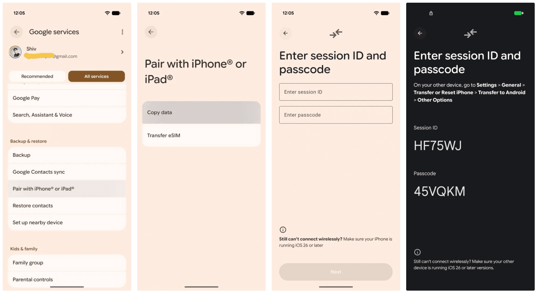 මෙම "Copy data" "option" එක නව "wireless data transfer" ක්රමයක් ආරම්භ කරයි. මෙම ක්රියාවලියේදී, පරිශීලකයින්ට ආරක්ෂිත දත්ත මාරුවක් සහතික කිරීම සඳහා "session ID" එකක් සහ "passcode" එකක් ඇතුළත් කිරීමට prompt කරනු ලබන අතර, මෙම "transfer" එක සාර්ථකව ක්රියාත්මක වීමට "iPhone" එක අනිවාර්යයෙන්ම "iOS 26" ධාවනය විය යුතු බවද සඳහන් වේ. මෙම "session ID" සහ "passcode" මූලික වශයෙන් "devices" අතර ආරක්ෂිත "handshake" එකක් ලෙස ක්රියා කරන්නේ, දත්ත මාරු කිරීමට පෙර දුරකථන දෙකම ආරක්ෂිතව සම්බන්ධ වී ඇති බව තහවුරු කරමිනි.