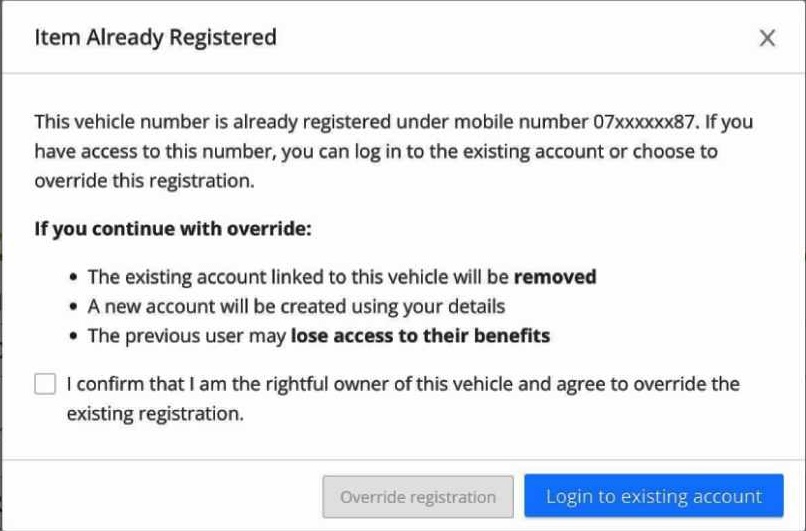 - එහිදී එම වාහනය දැනටමත් ලියාපදිංචි වී ඇති බවට පණිවිඩයක් ලැබෙනු ඇත. එවිට අදාළ පණිවිඩ කවුළුවේ දැක්වෙන 'Override registration' යන විකල්පය තෝරාගත යුතුය.