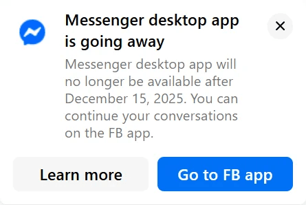 Meta සමාගම සඳහන් කර ඇත්තේ, Windows සහ macOS සඳහා වන Messenger App එක සම්පූර්ණයෙන්ම අත්හිටුවීමේ ක්රියාවලිය එළඹෙන 2025 දෙසැම්බර් 15 වැනිදායින් පසු අවසන් වන බවයි.