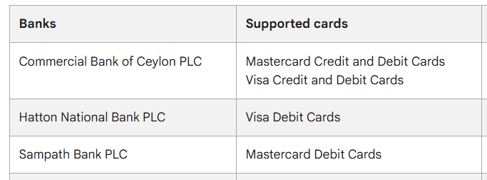 ශ්රී ලංකාව සඳහාත් Google සමගම ඔවුන්ගේ Google Pay සේවාව නිල වශයෙන්ම හඳුන්වා දී තිබෙන අතර මේ වන විට Commercial බැංකුව, Hatton National බැංකුව සහ Sampath බැංකුව Cards සමඟින් භාවිත කළ හැකි වනවා.